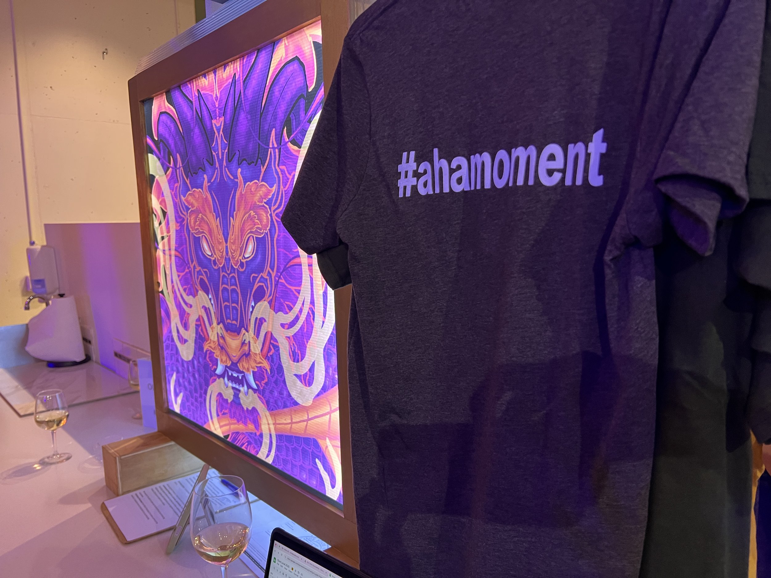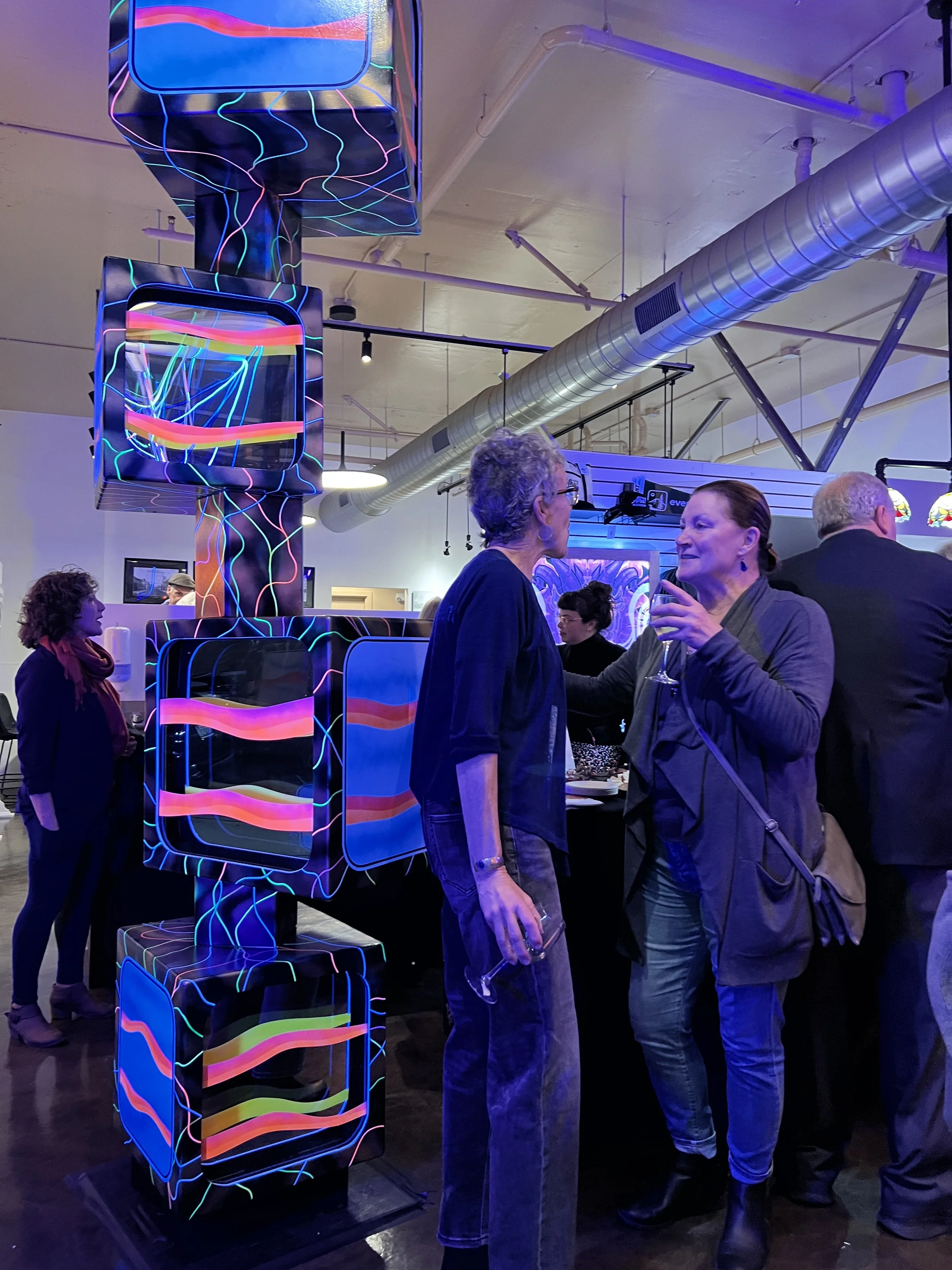 Working with light, as in collaborations with Illuminate Oly, transforms painting into a study of shadow and translucency. Every mark is carefully considered for how it interacts with illumination. The artist blends traditional and digital techniques to create this graphic painting that fuses symbolic imagery with the effects of electric light.