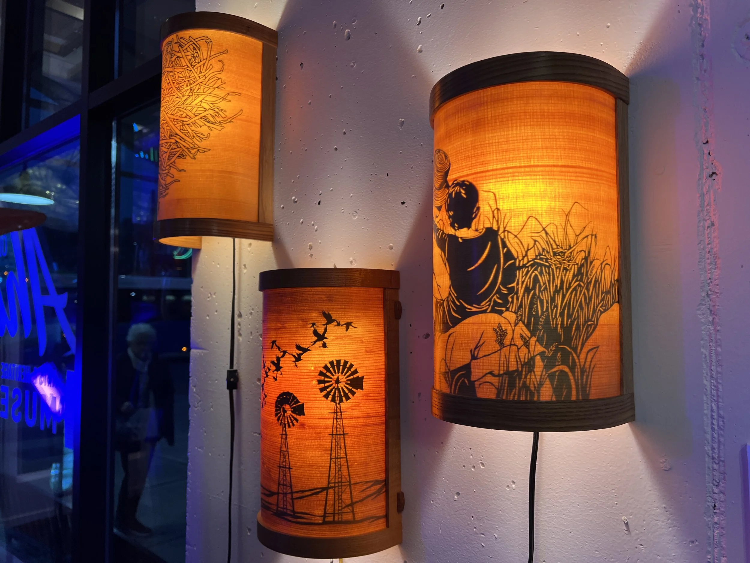 Experimenting with thin veneers of spruce, maple, and old-growth fir, the artist revels in the hidden beauty within the trees. Each sheet reveals a landscape of grain and color, brought to life when illuminated from within. The use of veneers allows the artist to extend the life of rare materials like old growth fir, preserving and honoring the wood while revealing its inner radiance.
