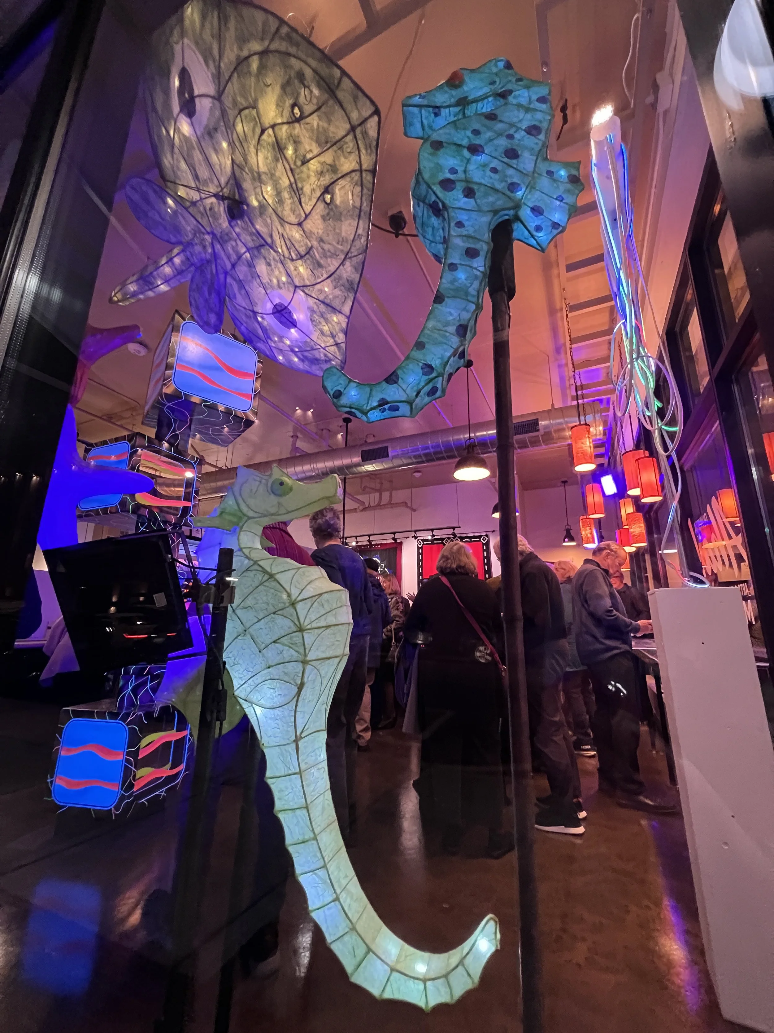 Participants of all ages create and share their art with one another and with the public. Workshops offer opportunities to explore paper mâché, painting, batik, and lantern making, allowing everyone to contribute to this vibrant community event. The sea life on display show how the Procession Studio is a place of learning: the small seahorse serves as a prototype for a class, while the large seahorse was Kris Geringer’s experiment in how to bring the idea to life.
